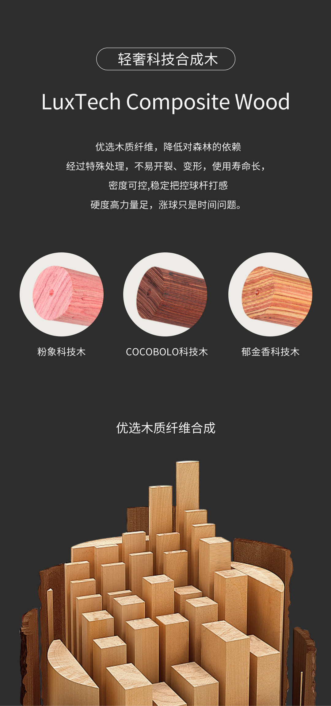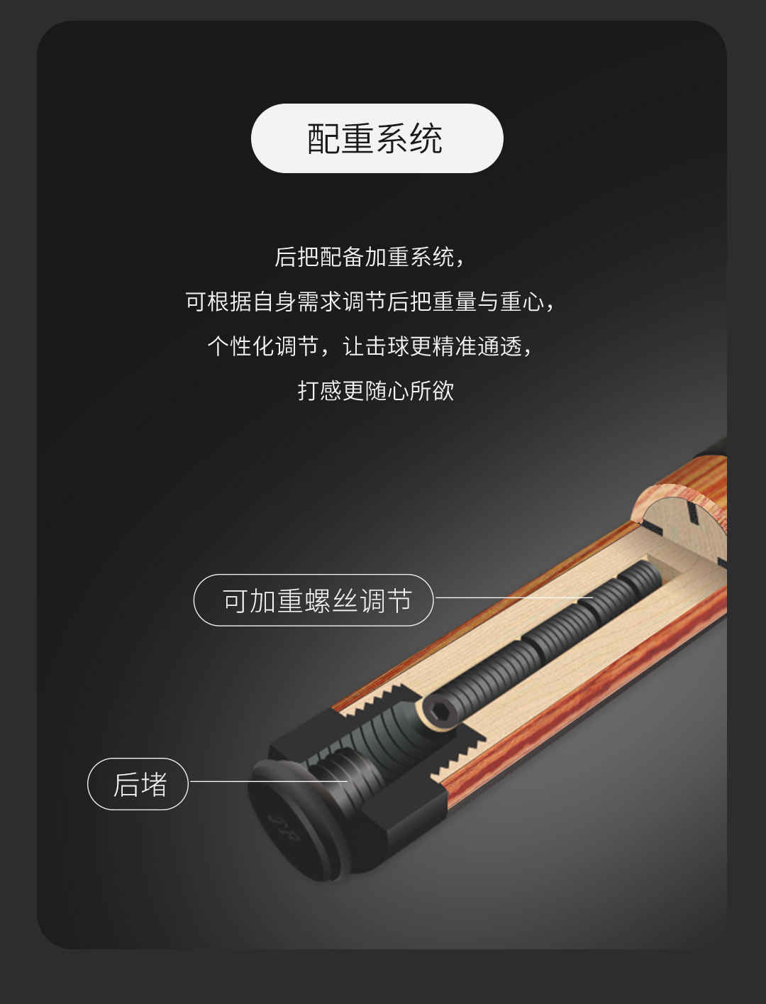 BK·FORCE的后把采用高科技合成木材质,结合内嵌碳纤维片结构,大幅提升了球杆的稳定性与力量传递效率。碳纤维的高强度特性有效抑制了击球时的震动与扭曲,使每一次出杆都更加精准、有力。无论是强力冲球还是细腻走位,科技合成木后把都能为选手提供无与伦比的操控体验。
